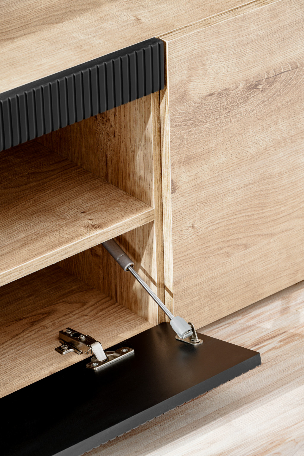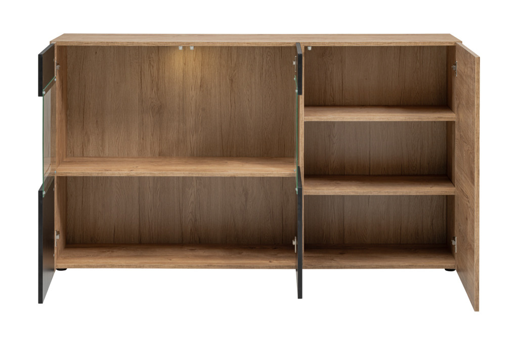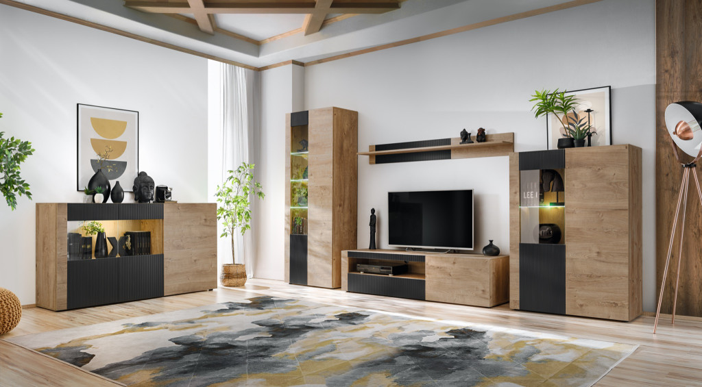 A Ribbeck tölgy dekor és a matt fekete frontok kombinációja letisztult, stílusos megjelenést biztosít, amely ideális választás nappalikba vagy társalgókba.