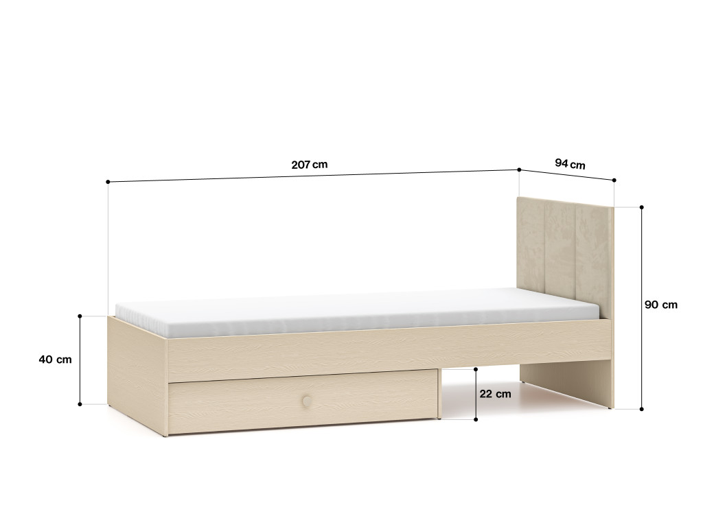 (Az ágykeret matrac nélkül kapható, de standard 90x200 cm-es méretű matraccal kompatibilis.)