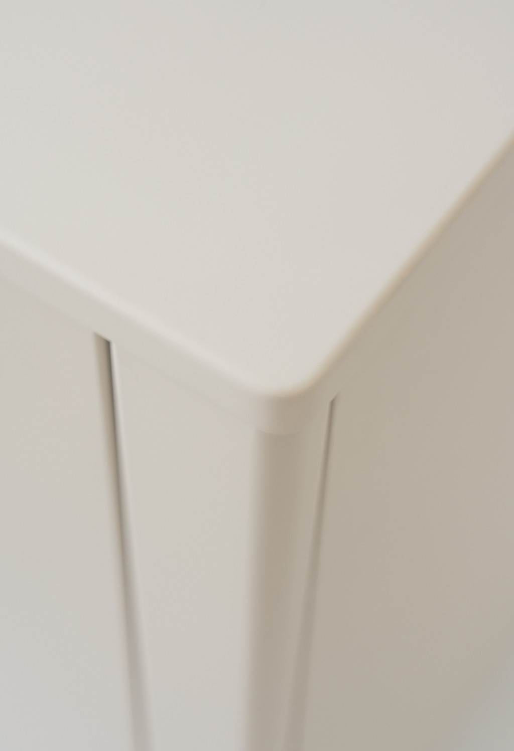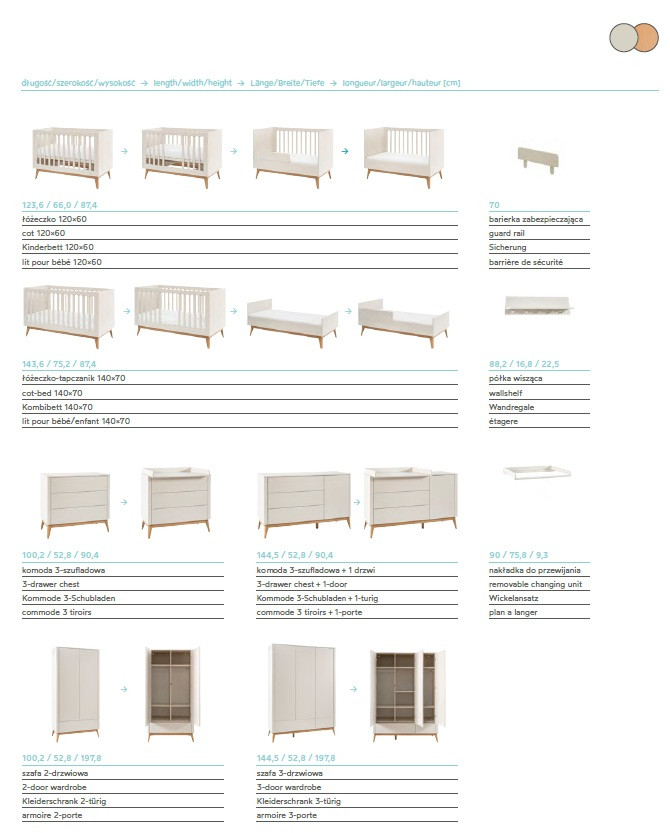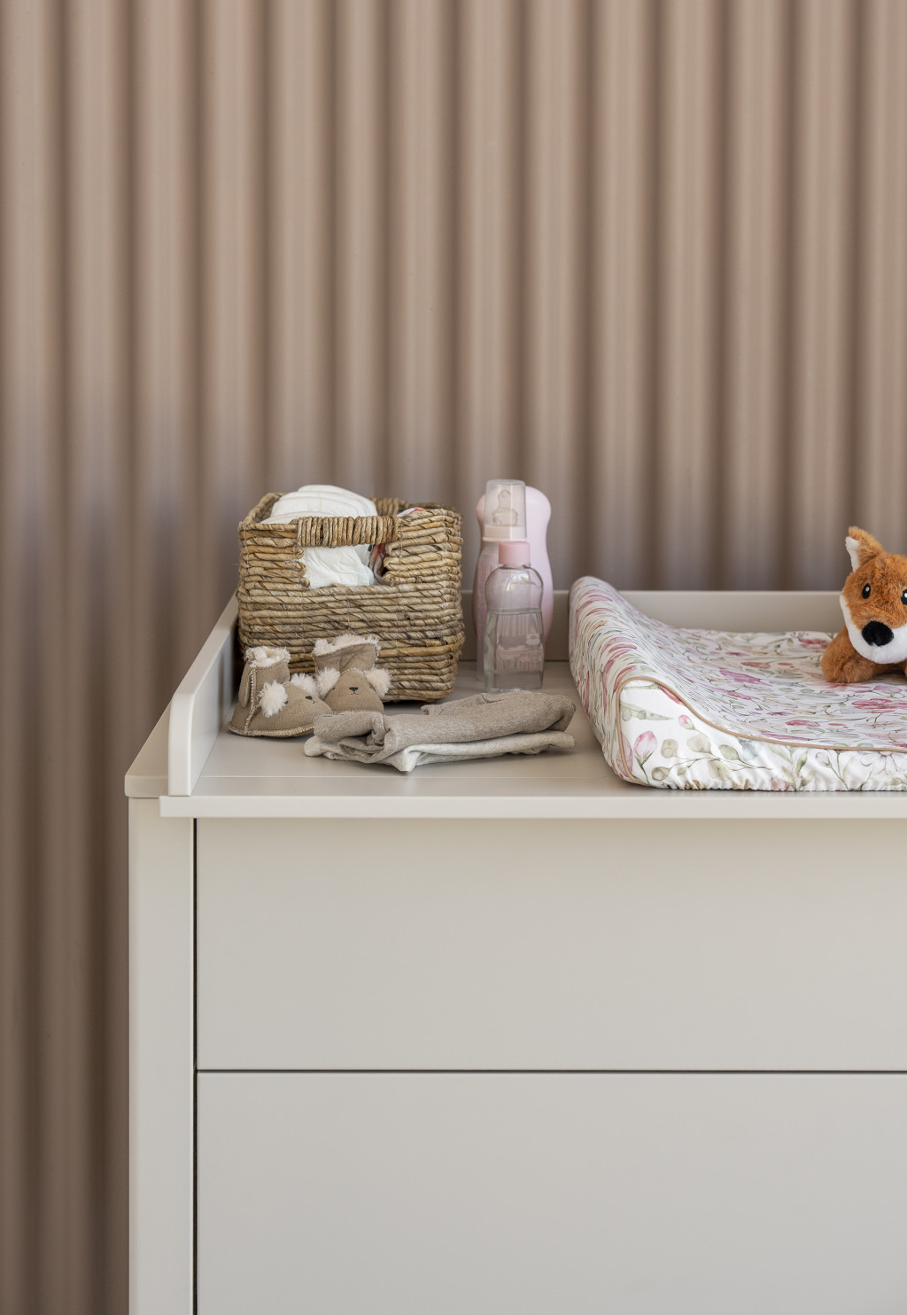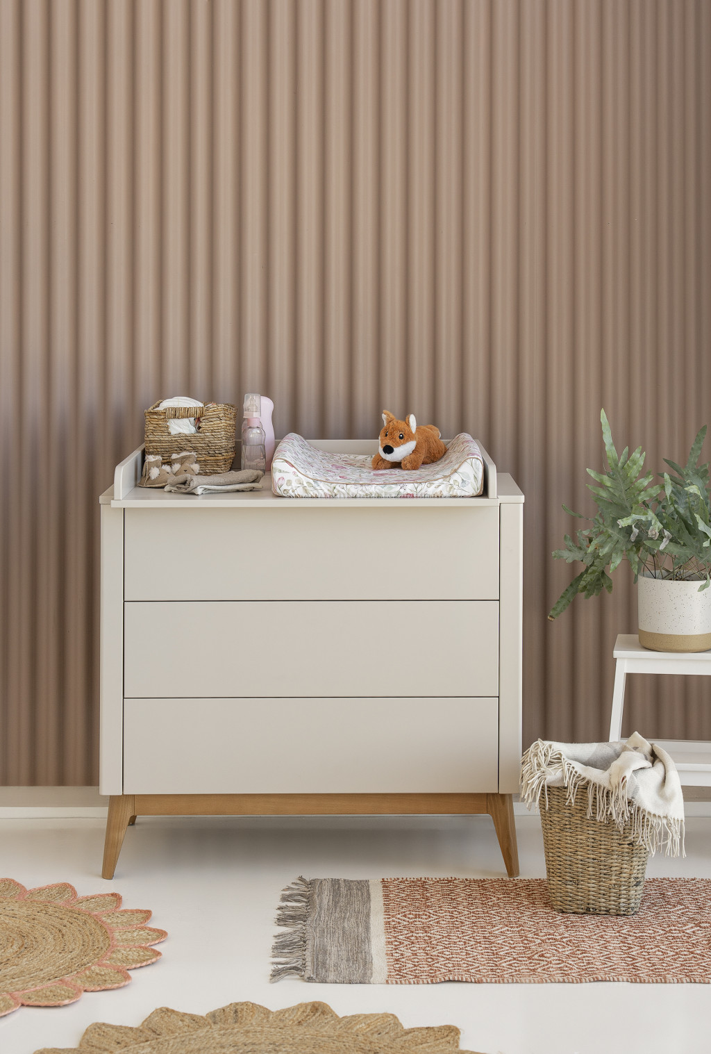 A komód strapabíró bútorlapból és festett MDF‑ből készül, tömör bükkfa lábakkal. Letisztult formavilága és elegáns champagne színe harmonikusan illeszkedik a Sato kollekció többi eleméhez. Opcionálisan pelenkázó feltét is rögzíthető rá.